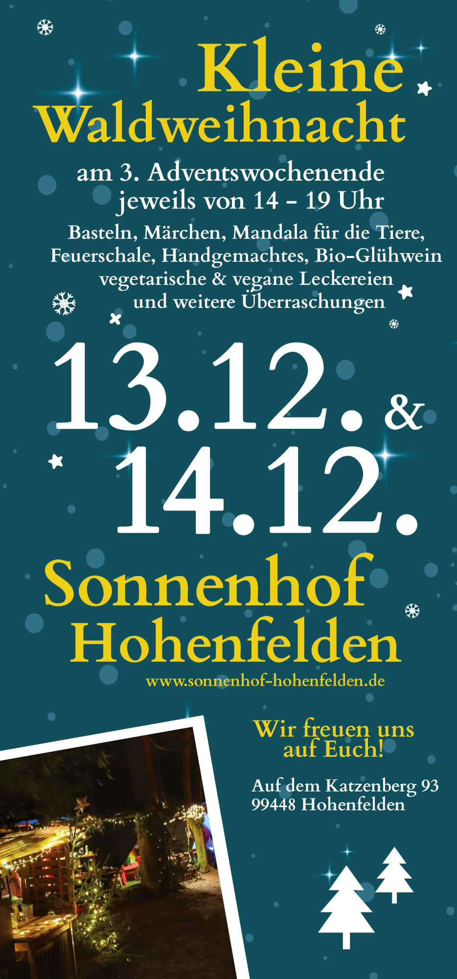 Liebe Gäste, am 3. Adventswochenende (13. & 14.12.) findet wieder von 14 bis 19 Uhr unsere Kleine Waldweihnacht statt.